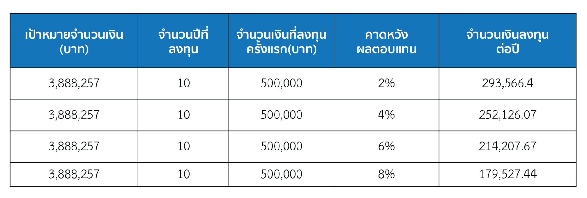 กำหนดให้เป้าหมายการลงทุน เพื่อเป็นค่าใช้จ่ายในปีที่ 11 และ 12 ตอนที่ลูกเรียน ป.โท โดยมีจำนวนเงินที่เป็นเป้าหมายทั้งหมด 3,888,257 บาท ซึ่งสามารถคำนวณจำนวนเงินลงทุนต่อปี ในแต่ละผลตอบแทนที่ต้องการได้ตามตารางข้างล่าง