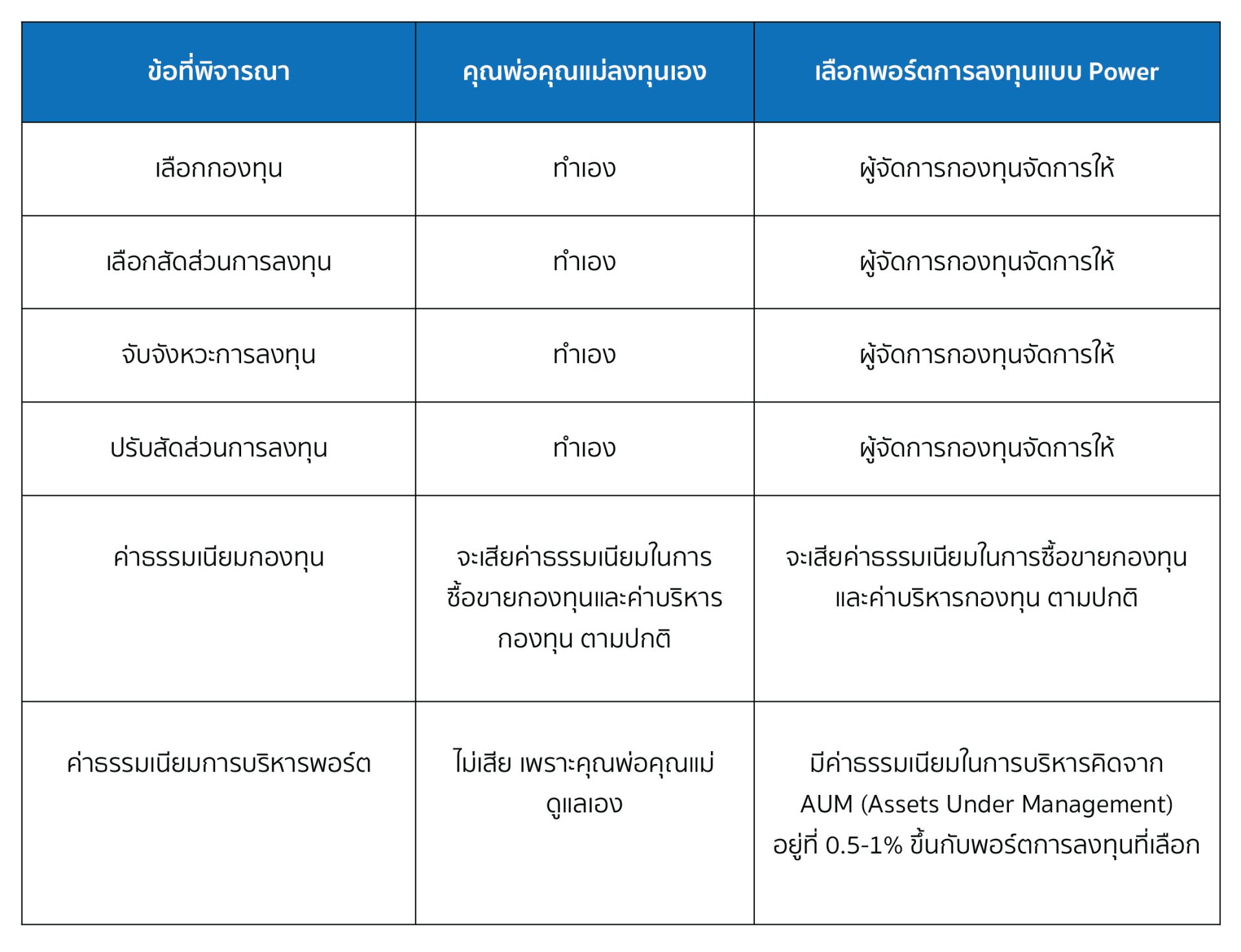 Power Growth เป็นหนึ่งในพอร์ตการลงทุนแบบ Power จะช่วยให้คุณพ่อคุณแม่ ไม่ต้องกังวัลกับการลงทุนอีกต่อไป มาดูกันว่าระหว่างลงทุนเองด้วยตัวเองกับต่างกับ พอร์ตการลงทุนแบบ Power อย่างไร