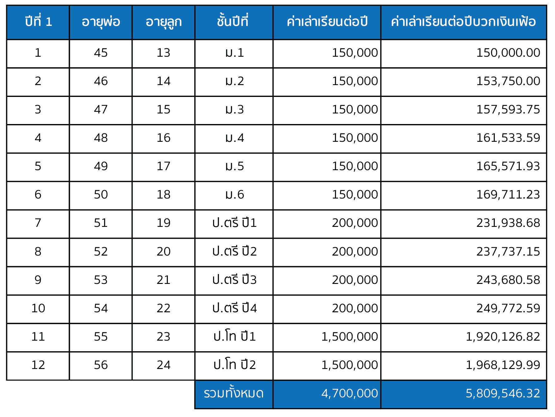 จะเห็นว่าจะต้องหางบประมาณค่าเล่าเรียนในแต่ละปีมาคำนวณงบประมาณทั้งหมด จะได้ว่า เงินที่จะต้องส่งลูกทั้งหมด 4.7 ล้านบาท แต่ถ้ารวมเงินเฟ้อที่ระดับ 2.5% แล้วจะกลายเป็นเงิน 5.8 ล้าน เพิ่มขึ้นถึง 23%