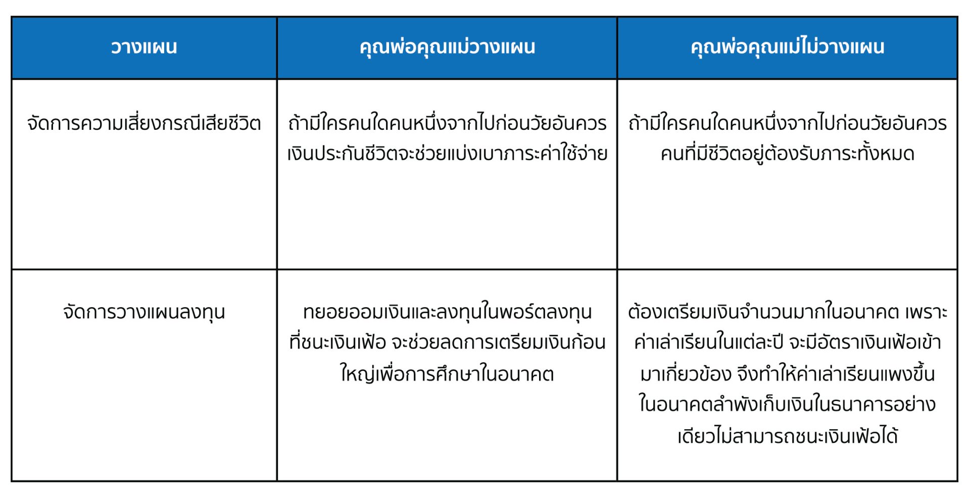 แผนการเงินแบบแรกที่คุณพ่อคุณแม่ควรจะจัดการคือ การจัดการความเสี่ยงกรณีเสียชีวิต การคำนวณทุนประกันชีวิตอย่างง่ายๆ คือ รวมค่าใช้จ่ายทั้งหมดจนลูกเรียนจบ ซึ่งถือว่าเป็นความรับผิดชอบของคุณพ่อคุณแม่ร่วมกัน
