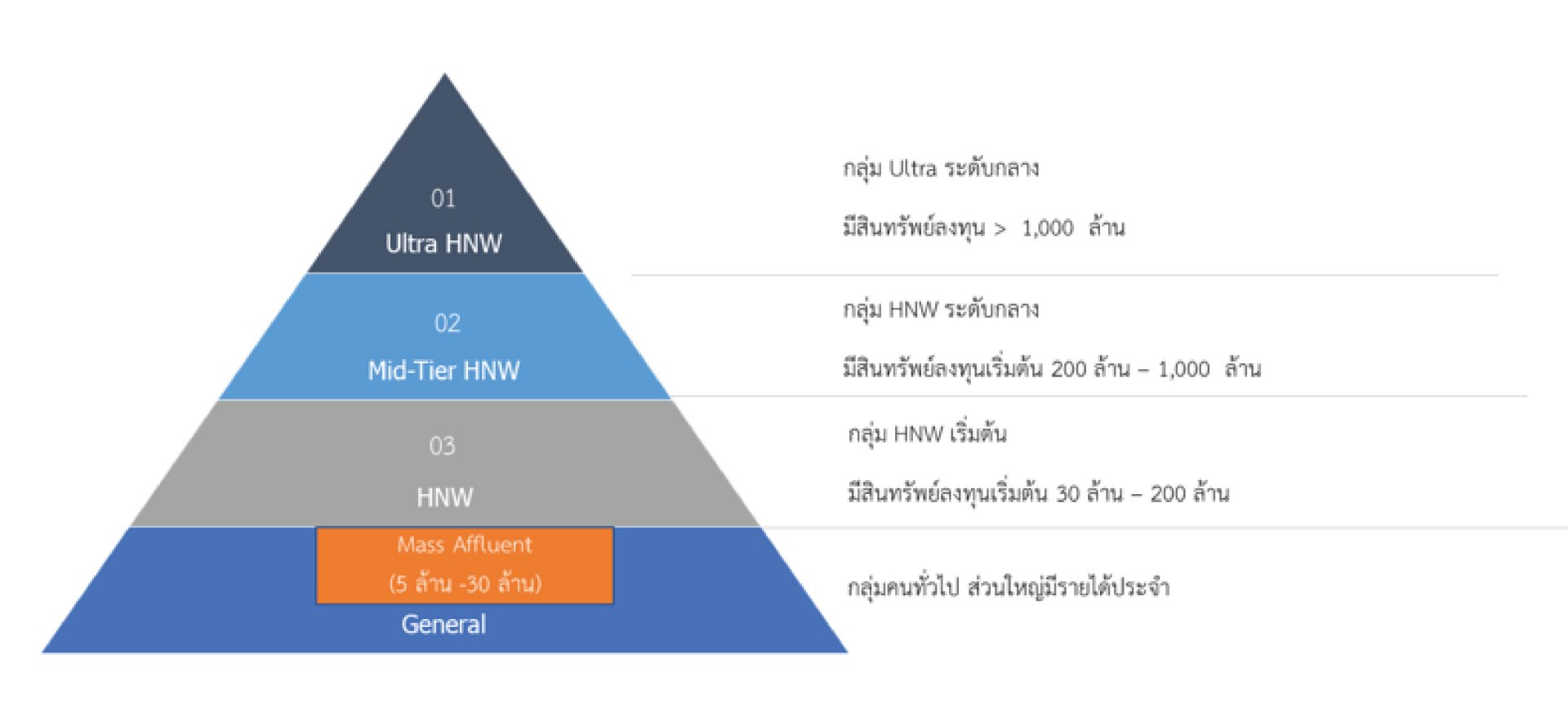 จากกลุ่มลูกค้าซึ่งแบ่งตามมูลค่าสินทรัพย์ ลองถามตัวเองดูว่า กลุ่มลูกค้าของคุณเป็นใคร ตลาดกลุ่มทั่วไปจะเป็นตลาดมีการแข่งขันเข้มข้นที่สุด จะดีกว่าไหมถ้าเราจะปรับเปลี่ยนกลุ่มลูกค้าดูแลกลุ่มลูกค้าที่ความมั่งคั่งมากขึ้น แต่ถ้าเปลี่ยนจะต้องพัฒนาองค์ความรู้และกระบวนการทำงานก็ต้องพัฒนาด้วย