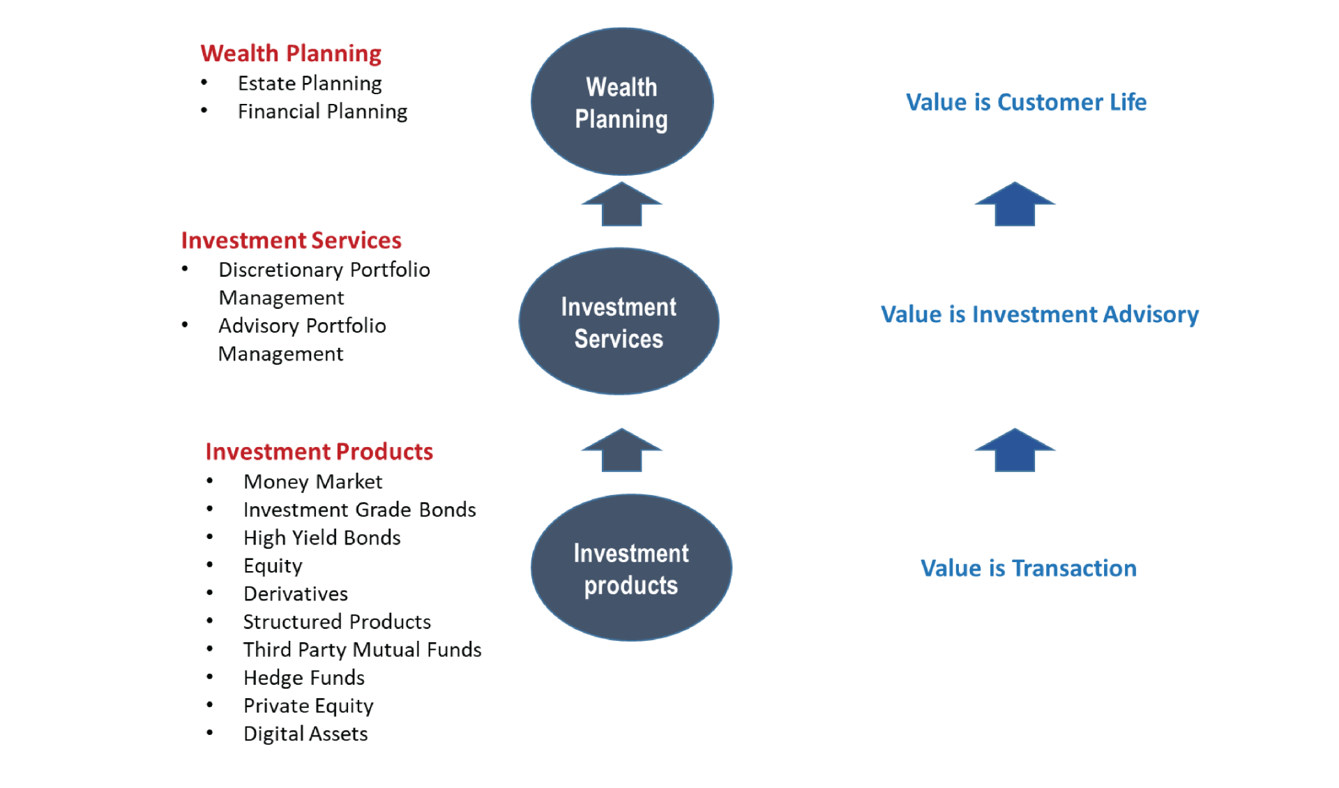 ยิ่งเข้าใจชีวิตลูกค้ามากเท่าไร ยิ่งมีคุณค่ามากขึ้น ยกตัวอย่างตามภาพ ถ้า Advisor แนะนำลูกค้าแค่ซื้อหุ้นตัวไหน ซื้อกองทุนอะไร ซื้อ RMF/ SSF อะไร คุณค่าของเขาคือ Transaction ถ้า Advisor แนะนำลูกค้าเป็นพอร์ตการลงทุน แทนที่จะซื้อแค่กองทุนทั่วไป คุณค่าของเขาคือ ผู้แนะนำพอร์ตการลงทุน ถ้า Advisor นอกจากการลงทุนแล้ว ยังคำนึงถืงการส่งต่อสินทรัพย์ไปยังทายาท คุณค่าของเขาไม่แค่เป็น ผู้แนะนำพอร์ตการลงทุน แต่คำนึงถึงด้านอื่นๆด้วย คุณค่าของเขาคือ ชีวิตของลูกค้า