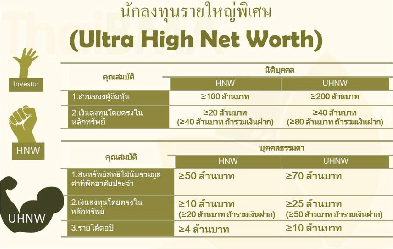 จากข้อมูลจาก Capgemini Financial Services พบว่า กลุ่มลูกค้าที่น่าสนใจคือ กลุ่ม HNW แบบ Millionaires Next Door ซึ่งจะมีสินทรัพย์ ประมาณ 30-150 ล้านบาท ลองมาดูหลักการของประเทศไทยกันบ้าง ออกโดย สำนักงาน ก.ล.ต