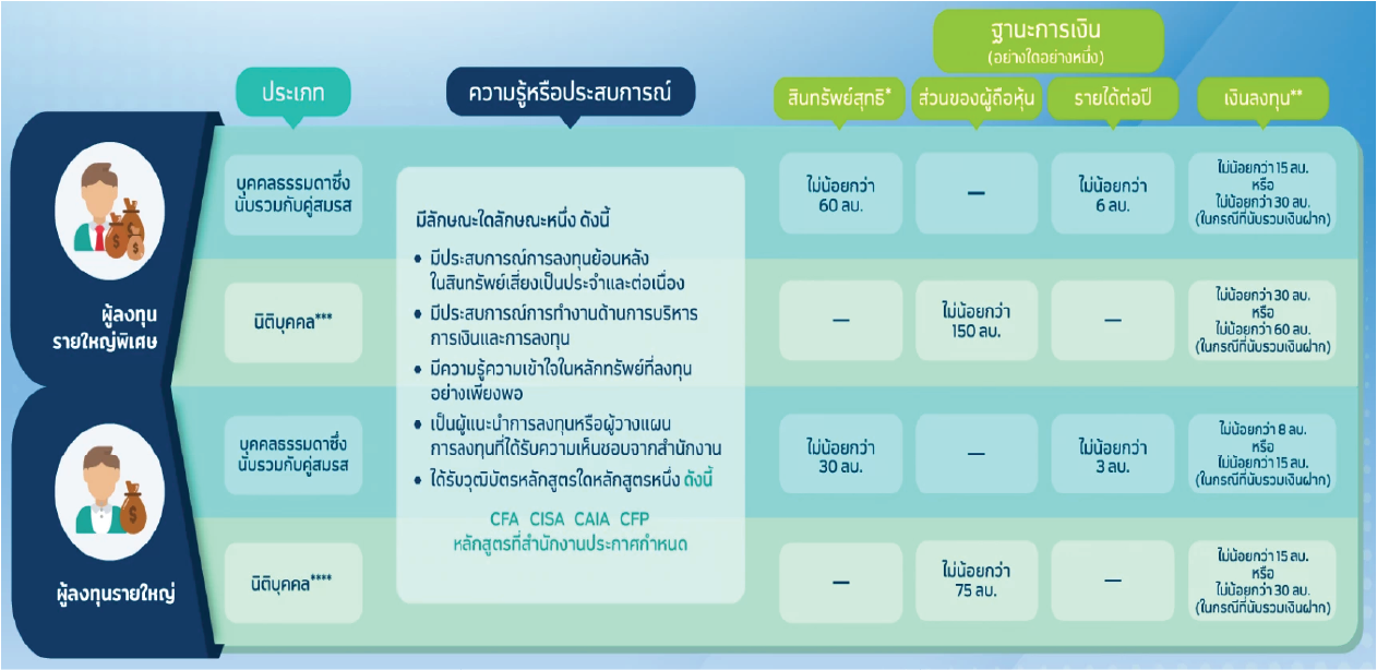 ถ้าเป็นบุคคลธรรมดา ต้องมีสินทรัพย์สุทธิไม่น้อยกว่า 50 ล้านบาท หรือ รายได้ต่อปีไม่น้อยกว่า 4 ล้านบาท หรือ เงินลงทุนตรงในหลักทรัพย์หรือสัญญาซื้อขายล่วงหน้าไม่น้อยกว่า 10 ล้านบาท หรือล่าสุด ทางสำนักงาน ก.ล.ต ได้มีการปรับเปลี่ยนเป็นดังนี้