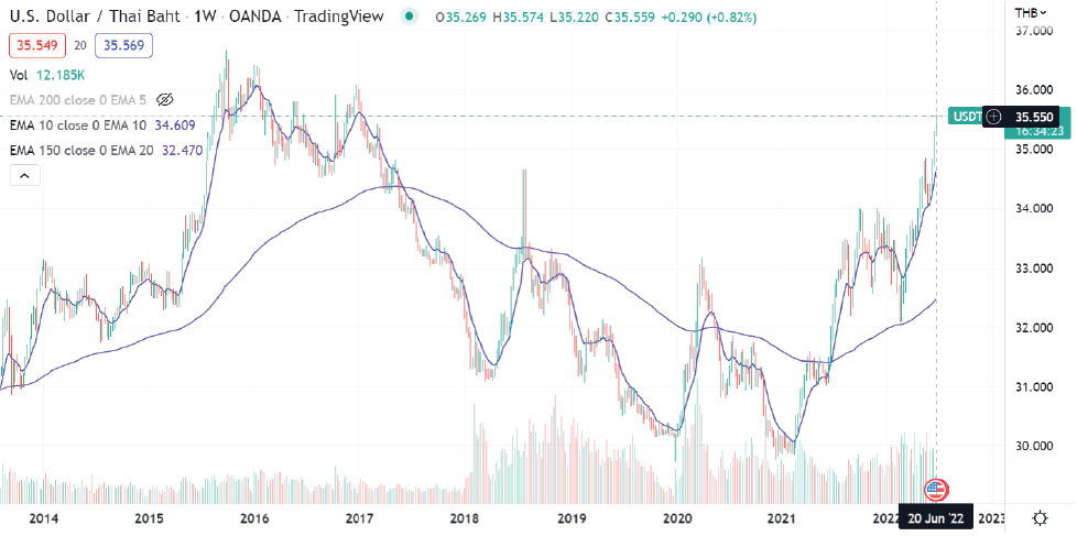 ส่งผลให้ Bath ไทยอ่อนค่าเทียบกับ USD พุ่งเป็น 35 บาท ต่อ 1 USD