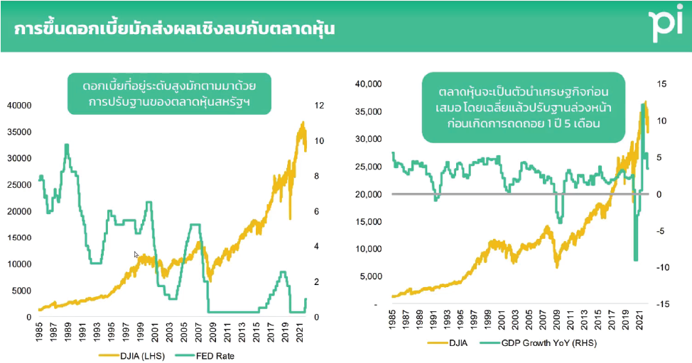 การที่ดอกเบี้ยเพิ่มอย่างเร็วและแรงของ USA เพื่อหยุดเงินเฟ้อที่สุดจะตามมาด้วย ตลาดหุ้นปรับฐานลงอย่างรวดเร็ว เนื่องจากตลาดหุ้นเป็น Leading Indicator ดังนั้น ตลาดหุ้นจะปรับตัวลดลงก่อน เศรษฐกิจจริงจะปรับตัวลดลง