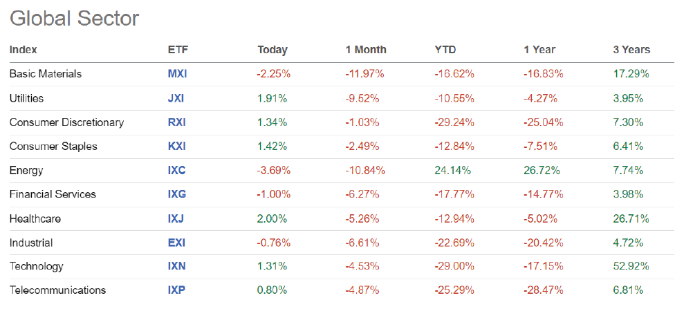 ถ้าใช้ Greed and Fear Index ในการวัดความโลภและความกลัวในตลาดหุ้น จะเห็นได้ว่า ตอนนี้ ตลาดหุ้นกลัวสุดขีดมากๆ ส่งผลให้ตลาดหุ้นโดยเทขาย ติดลบ ยกเว้นกลุ่มอุตสาหกรรมพลังงานที่ ผลตอบแทนแบบ YTD (ตั้งแต่ต้นปี) เป็นบวก คือ 24.14% อยู่กลุ่มอุตสาหกรรมด้วย นอกนั้นจะติดลบหมด โดยเฉพาะกลุ่ม technology และสิ่งค่าฟุ่มเฟือยจะติดลบหนักที่สุด