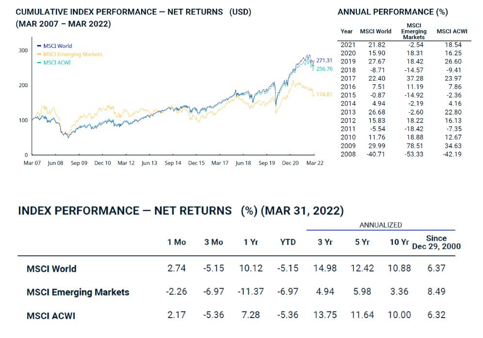 จากการเปรียบเทียบย้อนหลัง 10 ปีที่ผ่านมา  MSCI World ซึ่งเน้นไปที่ตลาดประเทศที่พัฒนาแล้ว จะมีผลตอบแทนที่ดีกว่า MSCI Emerging markets ซึ่งเน้นไปที่ตลาดประเทศเกิดใหม่