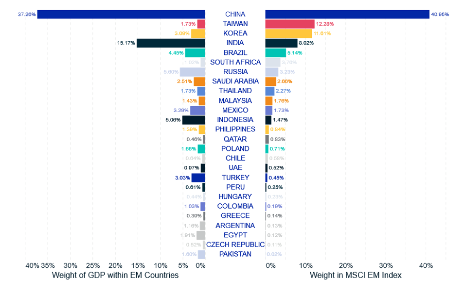 จะเห็นได้ว่า ประเทศจีนมีสัดส่วนใน MSCI Emerging market Index มากที่สุด  รองลงมาเป็นไต้หวัน และเกาหลี ตามลำดับ ส่วนประเทศไทย มีสัดส่วนอยู่ที่ 2.27%