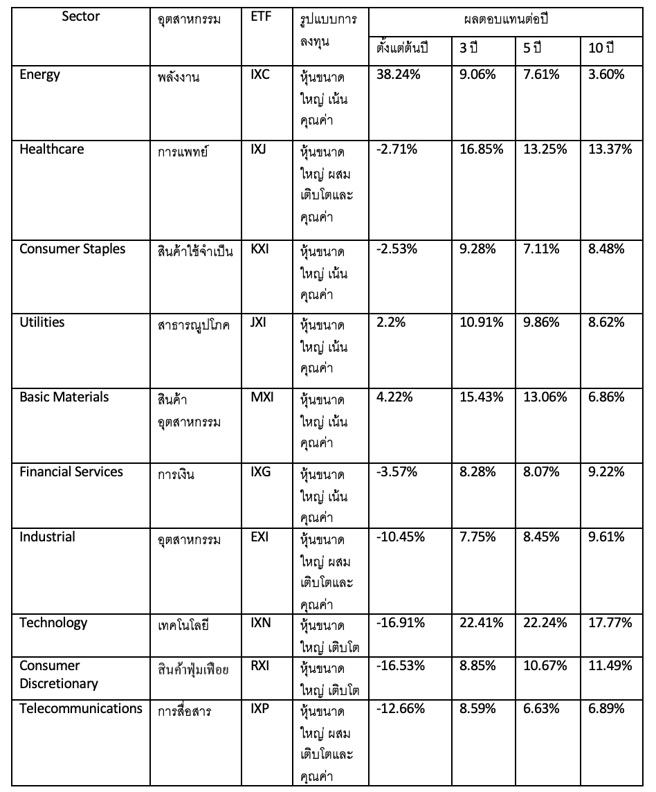 ผมขอใช้ ETF ของค่าย ishare เป็นตัวอ้างอิงจะสรุปข้อมูลแต่ละ Sector ดังนี้