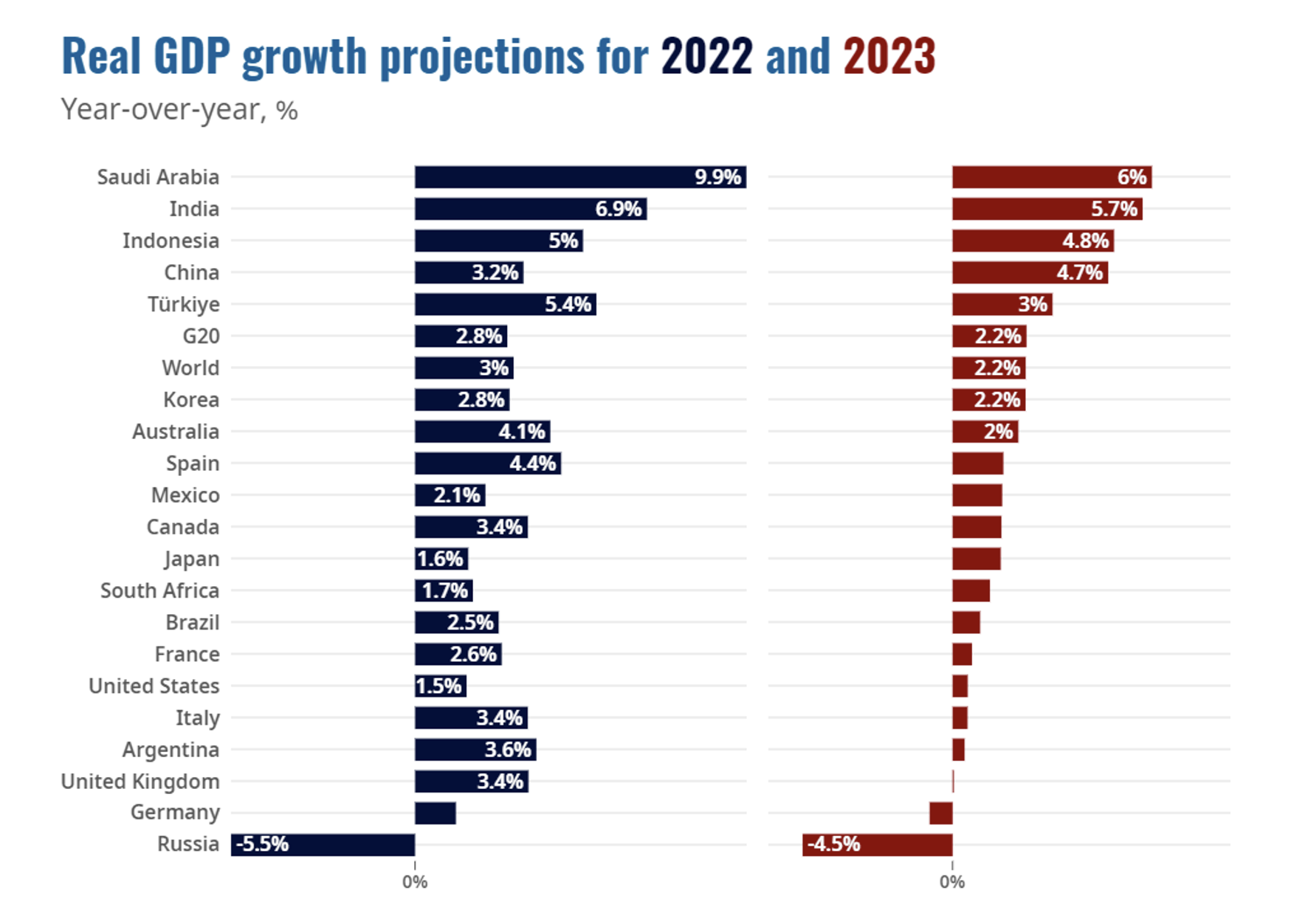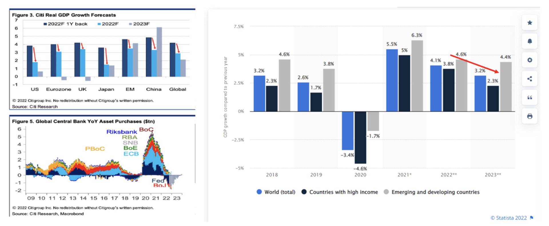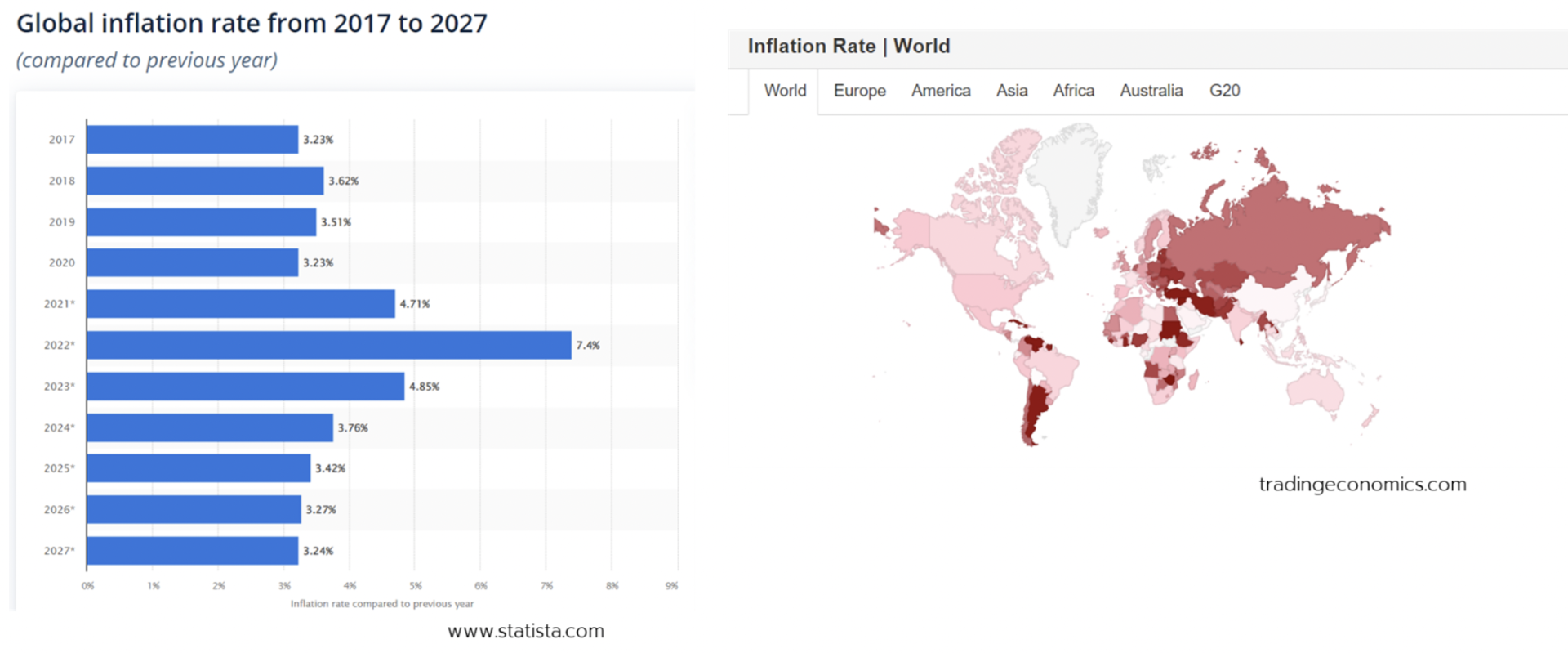 Global Inflation rate เพิ่มสูงขึ้น และจะค่อยทยอยปรับลดลงในปีต่อไป และแถบประเทศ Euro มี inflation ที่สูงเทียบกับพื้นที่อื่นๆ เนื่องจากมีสงคราม