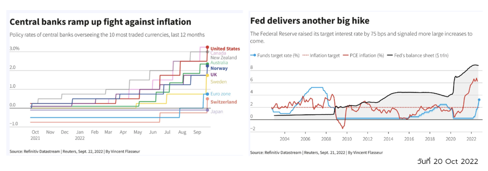 ธนาคารกลางของแต่ละประเทศขึ้นดอกเบี้ยเพื่อสู้กับเงินเฟ้อที่สูง โดยเฉพาะ Fed มีท่าที Hawkish ในการขึ้นดอกเบี้ยมาก