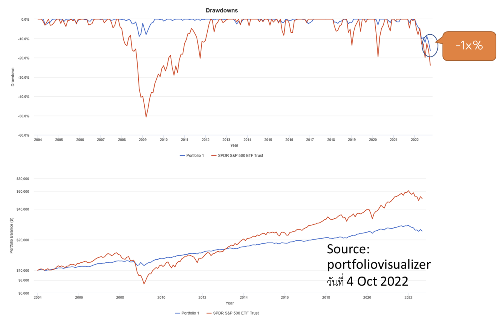 ทำการทดสอบด้วย S&P500 ETF เป็นกองทุนดัชนี S&P500 และ AGG ETF เป็นกองทุน USA ตราสารหนี้ โดยทดสอบปี 2004 – Aug 2022