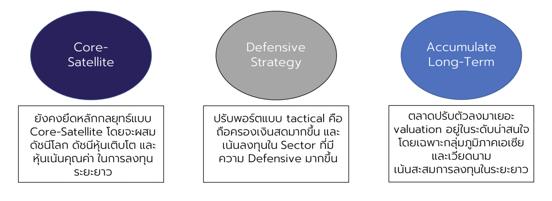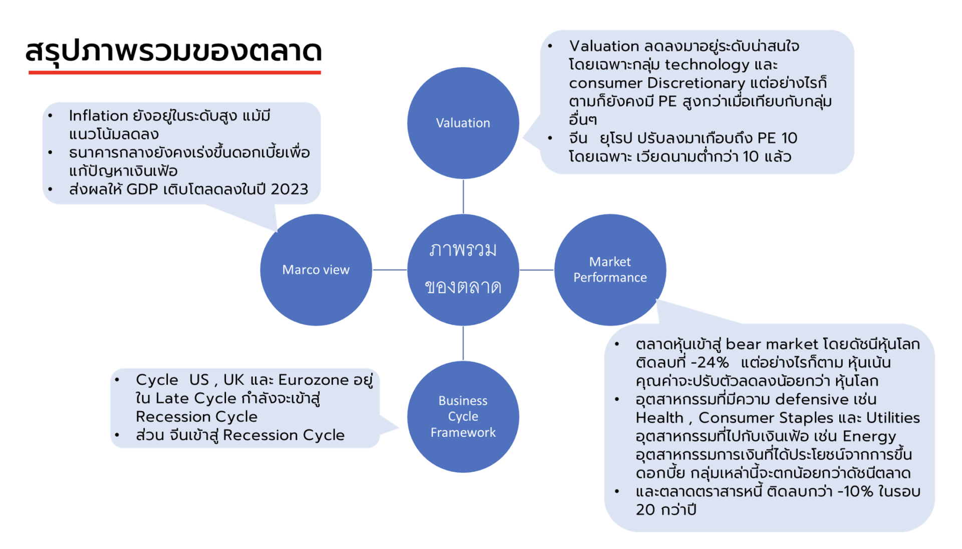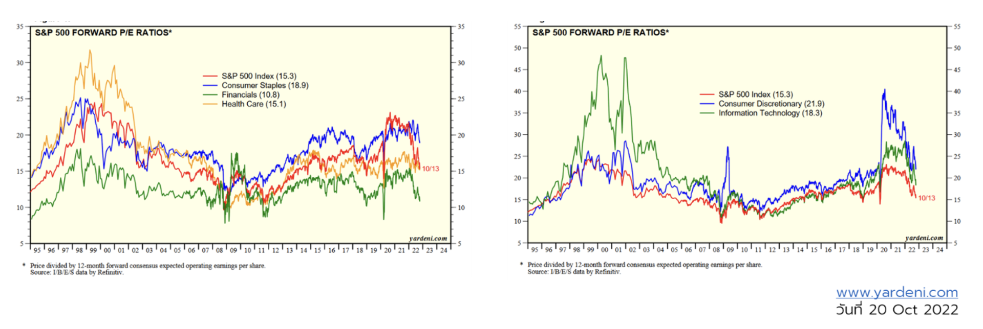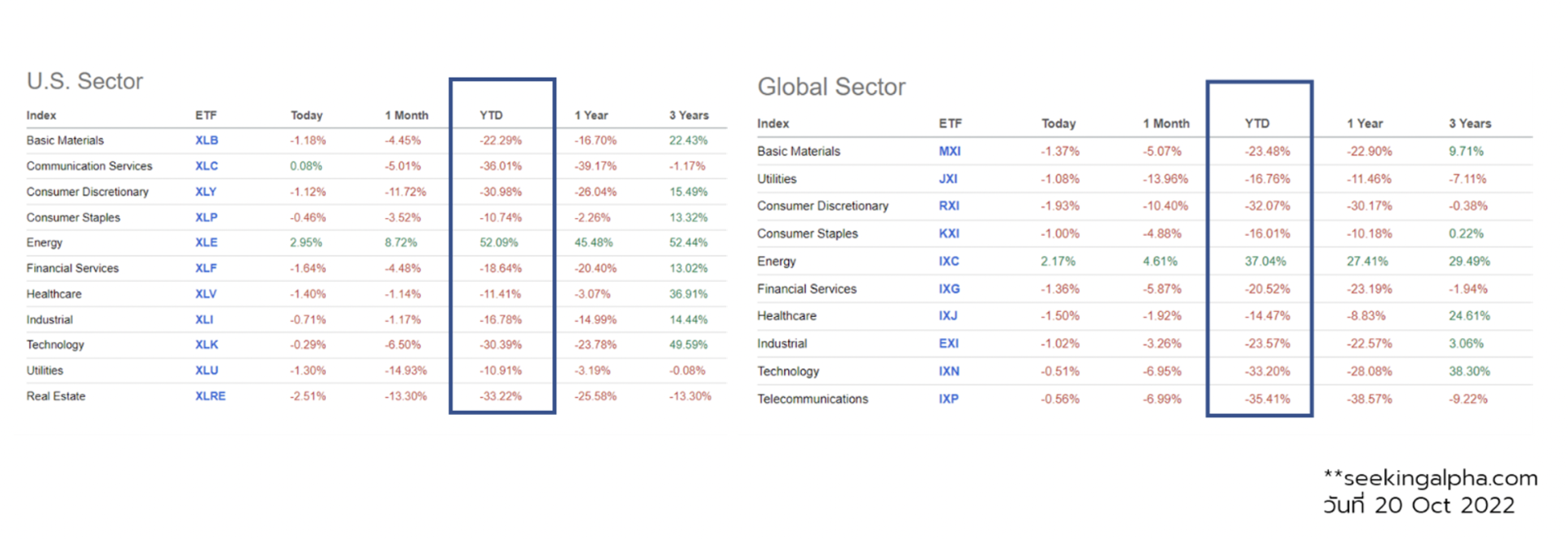 อุตสาหกรรมที่มีความ defensive เช่น Health , Consumer Staples และ Utilities อุตสาหกรรมที่ไปกับเงินเฟ้อ เช่น Energy อุตสาหกรรมการเงินที่ได้ประโยชน์จากการขึ้นดอกบี้ย กลุ่มเหล่านี้จะตกน้อยกว่าดัชนีตลาด