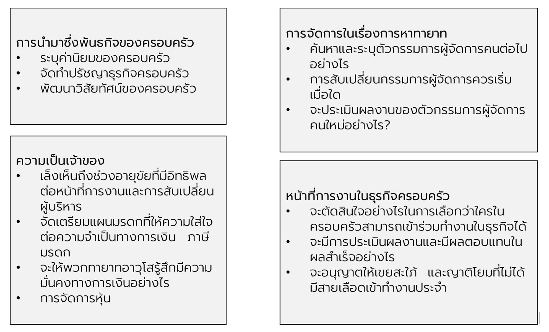 เริ่มจากฝั่งซ้าย คือ การส่งต่อธุรกิจครอบครัว ( Family Business Planning ) และ การวางแผนสร้างทายาท Business Succession Planning