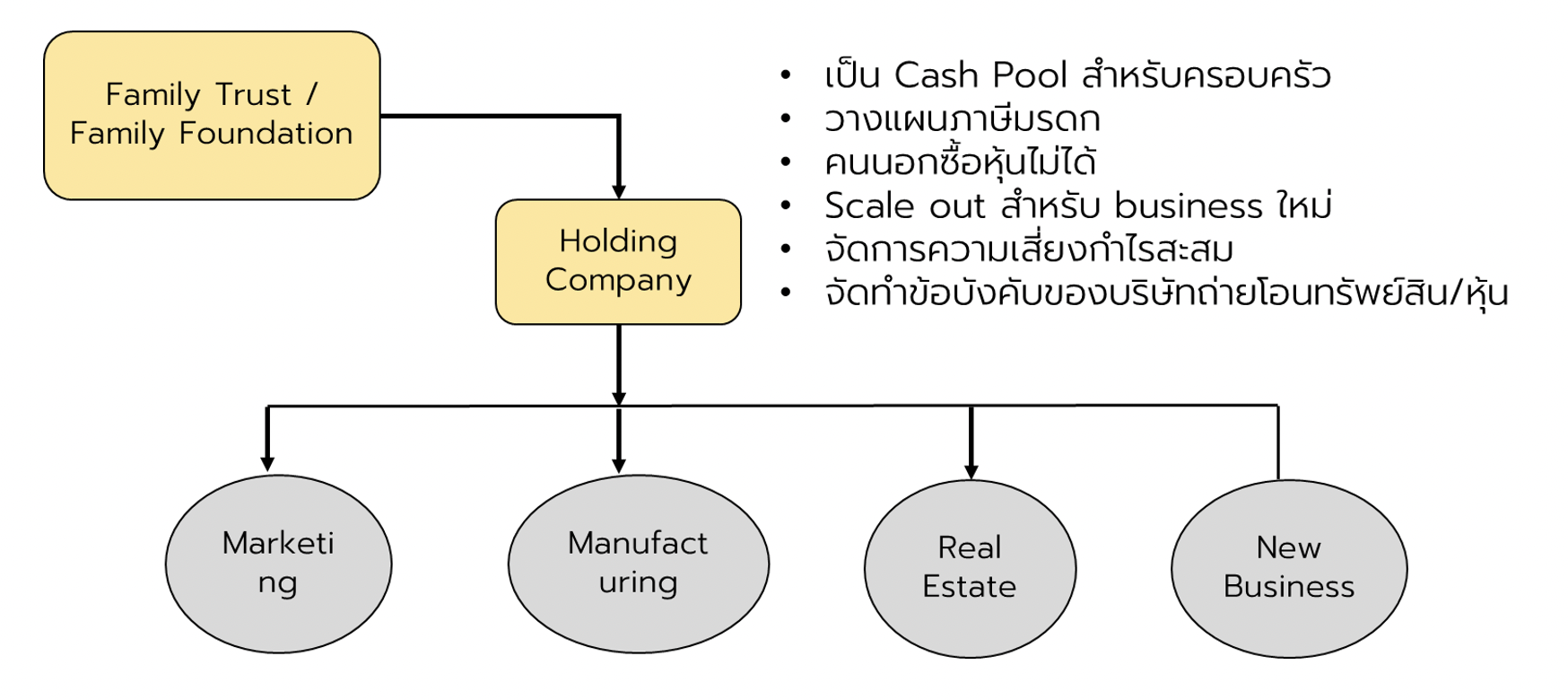 เมื่อจัดทำธรรมนูญครอบครัวแล้ว ก็ต้องการจัดทำโครงสร้างใหม่สำหรับแผนในอนาคต จัดทำข้อบังคับของบริษัทถ่ายโอนทรัพย์สิน/หุ้น ตัวอย่างเช่น