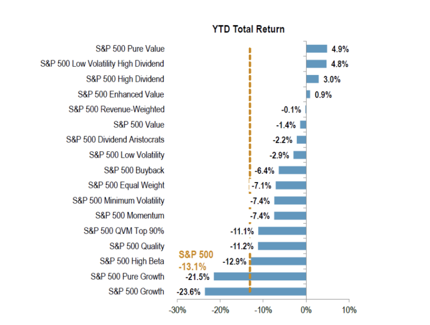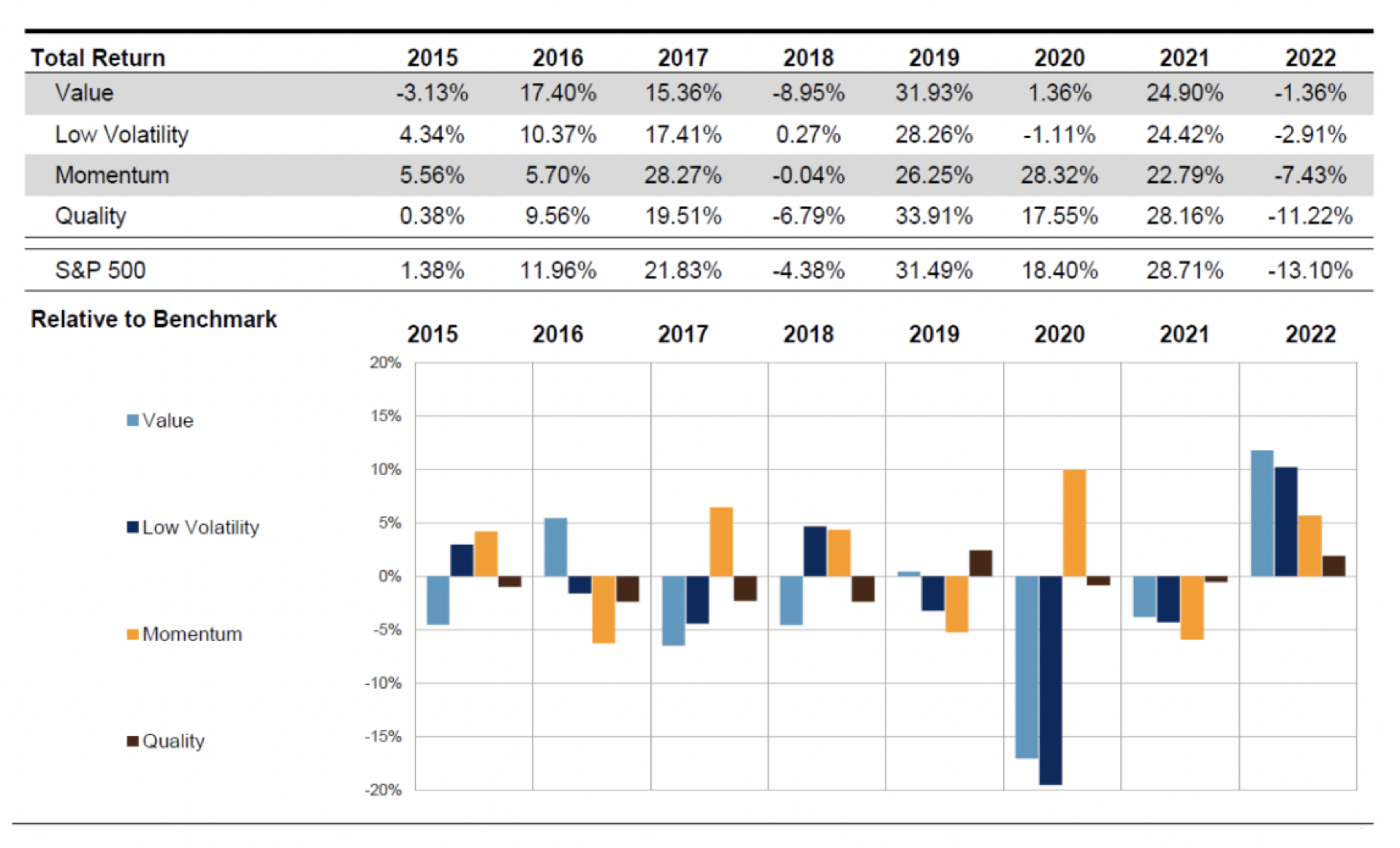 - เมื่อเกิด Criss ทางการเงิน หรือ Economic Cycle อยู่ในช่วงชะลอตัว Factor ที่จะ outperform ได้คือ Low volatility และ Value อย่างเช่นในปี 2022 ดูผลตอบแทนตามรูปข้างล่างได้ จะทำให้ชัดเจนมาก