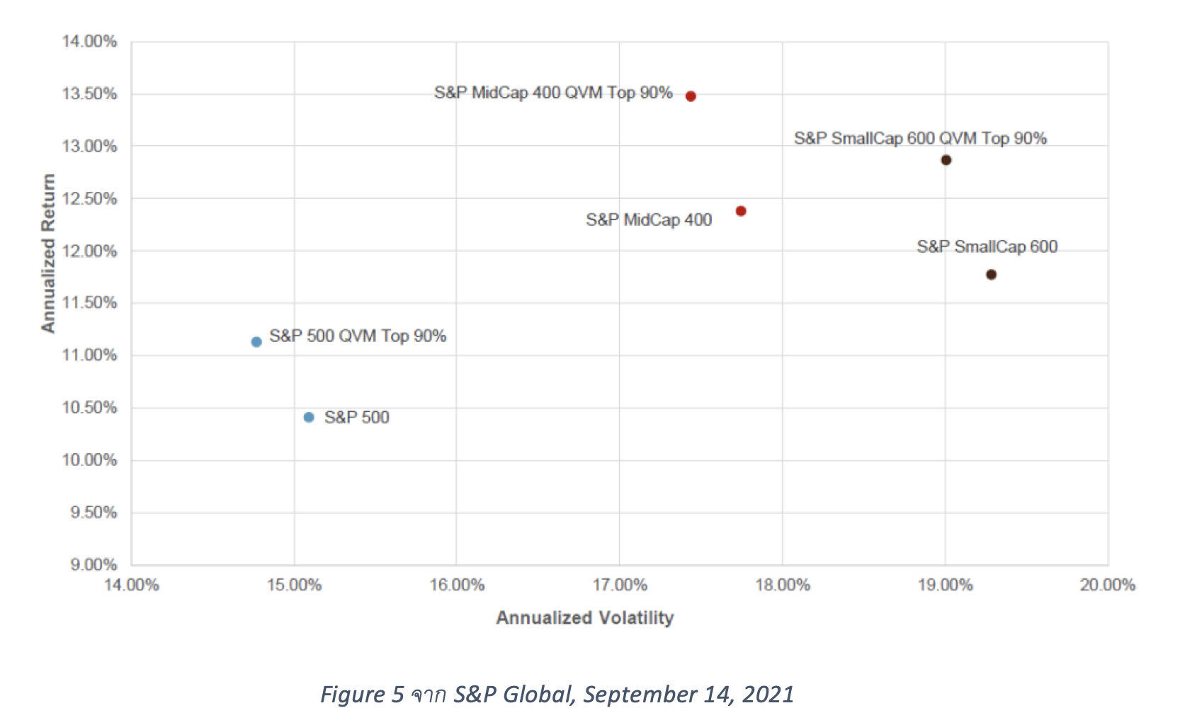 จะเห็นได้ว่า ผลตอบแทนของ S&P500 QVM สามารถชนะ S&P500 ได้ และมีความผันผวนน้อยกว่าด้วย
