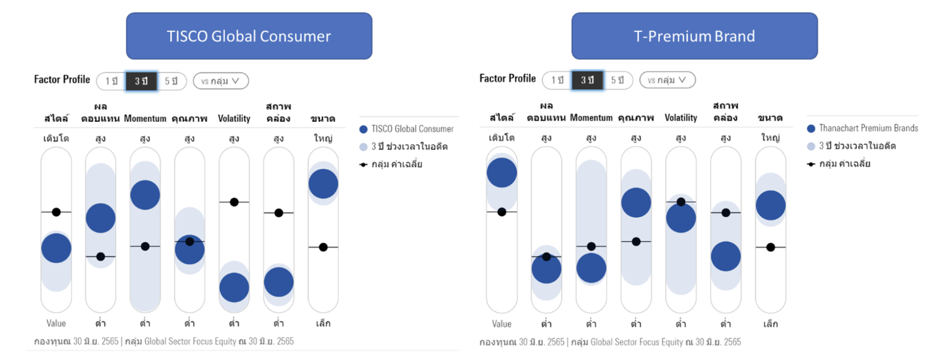 นักลงทุนสามารถเข้าไปดู Factor Style ได้จาก  www.morningstarthailand.com ได้ข้อมูลดังรูป โดยผมจะเปรียบเทียบกองทุน 2 กองทุน คือ TISCO Global Consumer และ T-Premium Brand