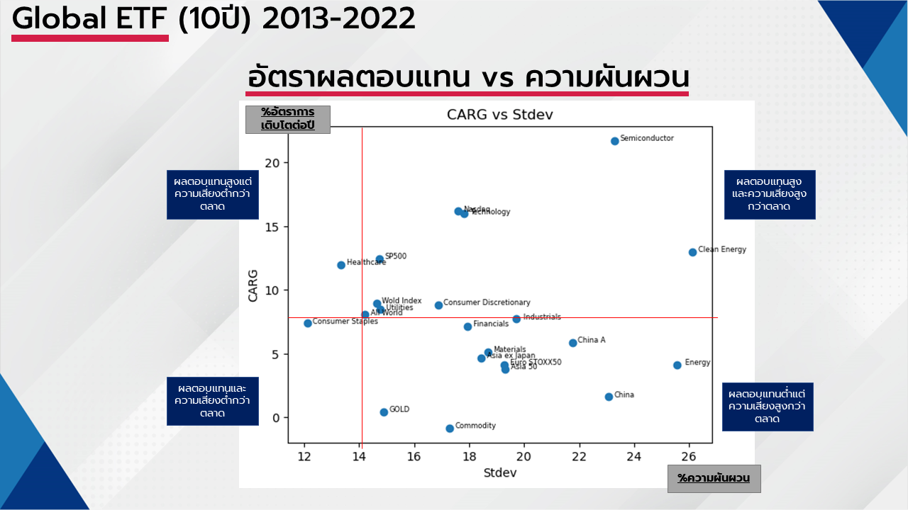 · ในรอบ 10 ปีที่ผ่านมา ดอกเบี้ยอยู่ในระดับต่ำ และ มีสภาพคล่องสูง กลุ่มอุตสาหกรรมพวก technology จะให้ผลตอบแทนสูง แต่ขณะเดียวกันก็มีความผันผวนสูงด้วยเช่นกันโดยกลุ่ม Semiconductor จะให้ผลตอบแทนดีที่สุดแต่ความผันผวนสูงที่สุด