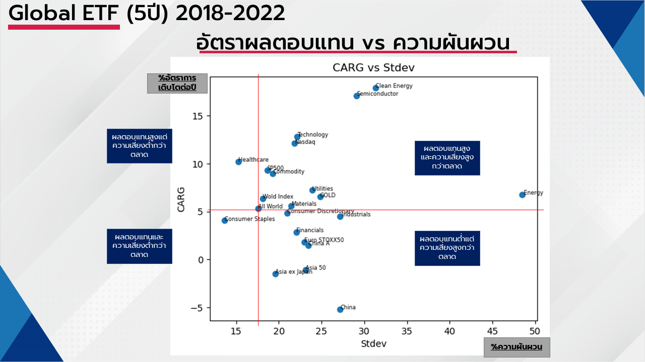 ·กลุ่มอุตสาหากรรม Healthcare และ Consumer Staple เป็นอุตสาหกรรมที่มีความผันผวนต่ำกว่า ตลาด (All World Index) แต่ Healthcare มีผลตอบแทนสูงกว่าตลาด