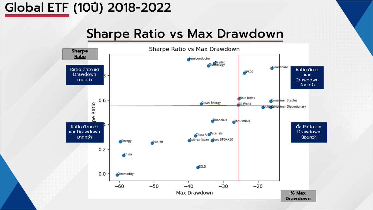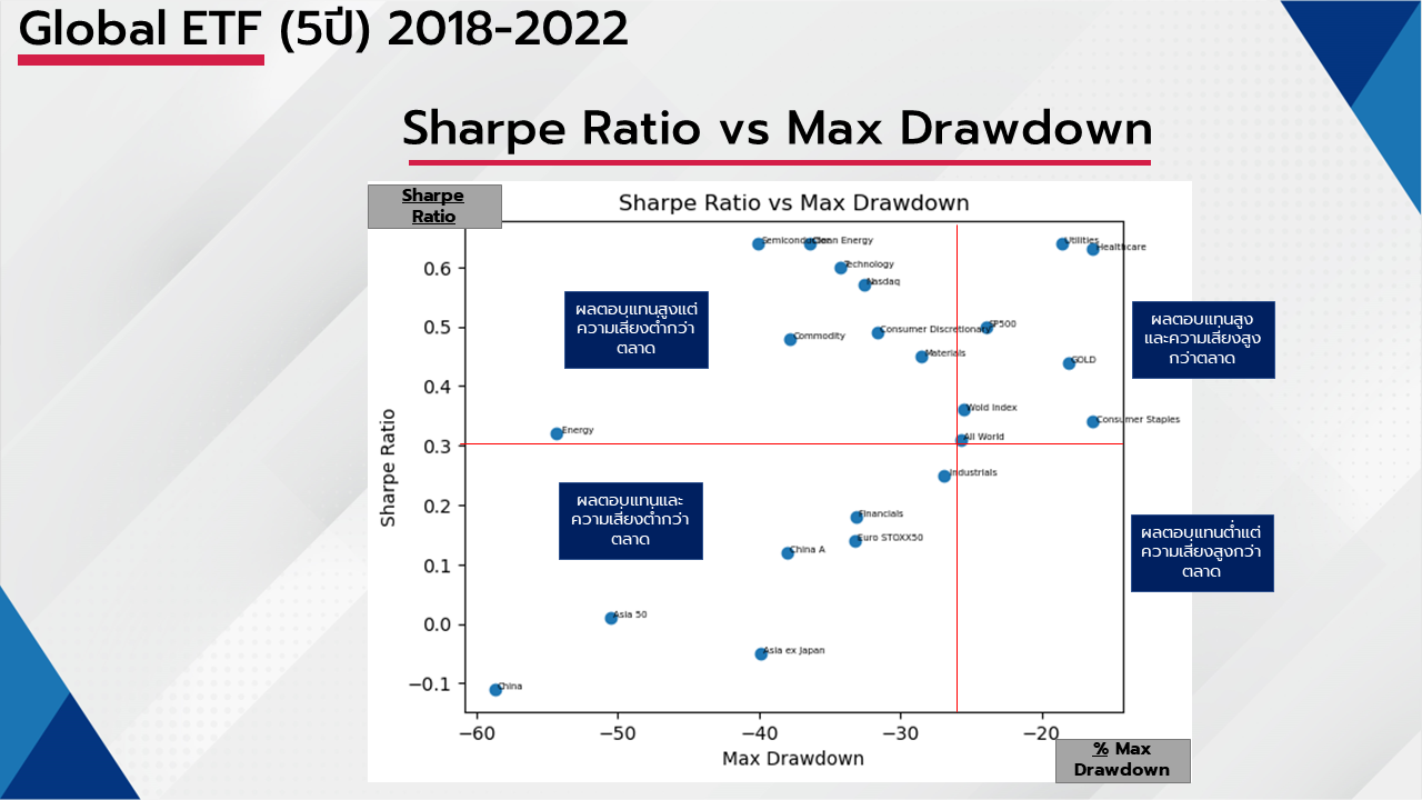 2) Sharpe Ratio vs Max Drawdown (ผลตอบแทนต่อความเสี่ยง vs ติดลบมากที่สุด)